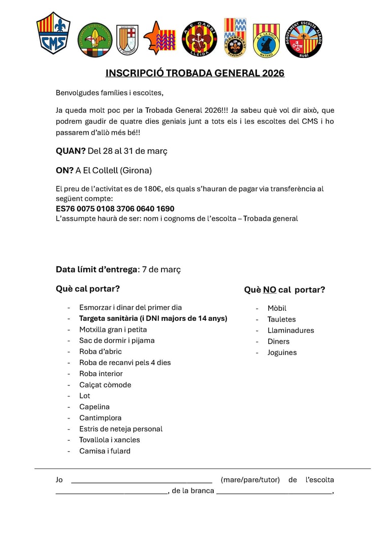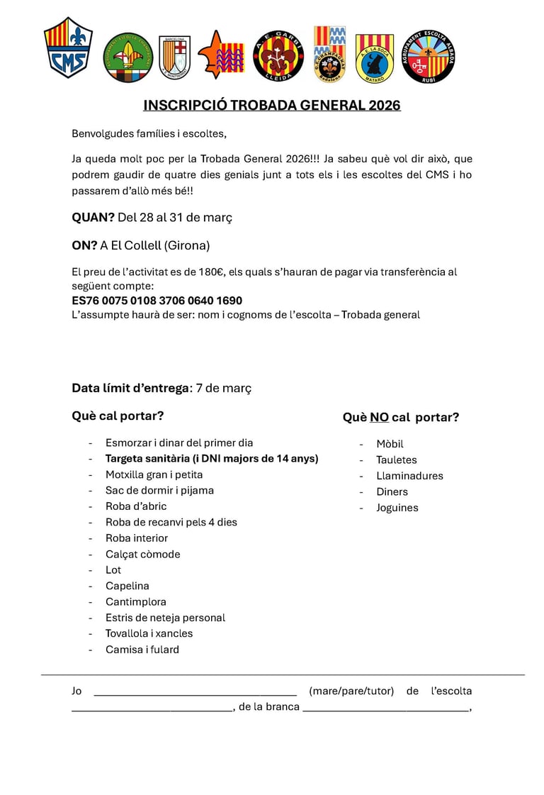 Per participar-hi cal portar la inscripció impresa al cau (a secretaria o els dissabtes) abans del 7 de març.